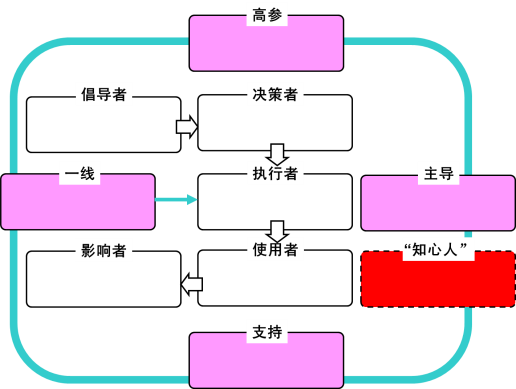 客户采购的倡导者、决策者、执行者和使用者是容易辨识,但影响者不易确定,所以要全方位、多层次收集信息、综合判断,最佳方法就是创造全方位、多层次的助力影响者。影响者是对倡导者、决策者、执行者和使用者中一方或多方有影响力的人。