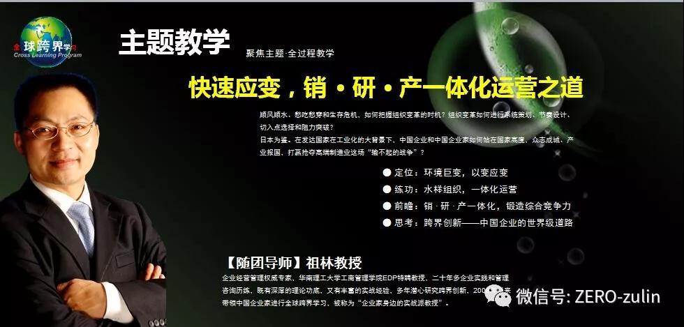 二十年多企业实践和管理咨询历练,祖林教授既有深厚的理论功底,又有丰富的实战经验,多年潜心研究跨界创新,2008年以来带领中国企业家进行全球跨界学习,被称为“企业家身边的实战派教授”。