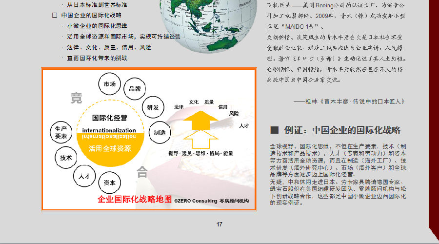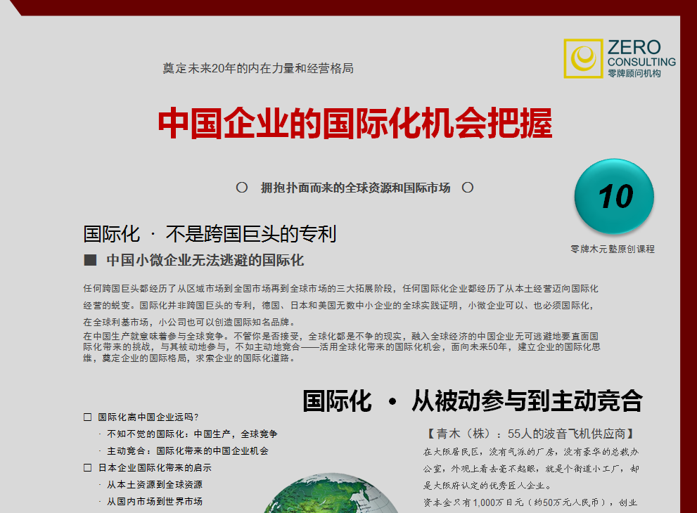 在中国生产就意味着参与全球竞争。不管你是否接受,全球化都是不争的现实,融入全球经济的中国企业无可逃避地要直面国际化带来的挑战,与其被动地参与,不如主动地竞合——活用全球化带来的国际化机会,面向未来50年,建立企业的国际化思维,奠定企业的国际格局,求索企业的国际化道路。