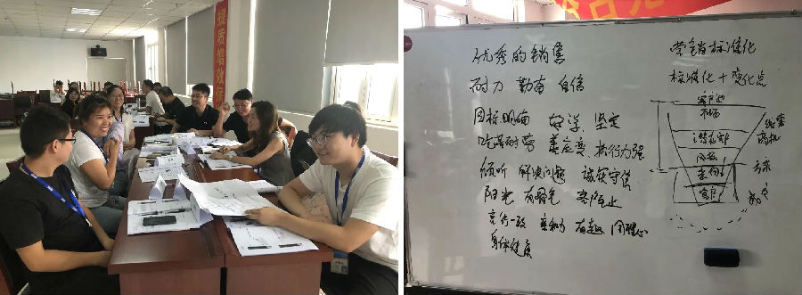课程开始的团队建设环节,就让大家轻松进入状态,队名、口号、展示让小组伙伴凝聚力、目标感瞬间提升。结合自己的认知,从优秀销售需要具备的特质开始谈论,大家积极贡献,讨论出来:耐力、勤奋、自信、目标明确、好学、坚定、吃苦耐劳、执行力强、倾听、解决问题、诚实守信等19个特质。